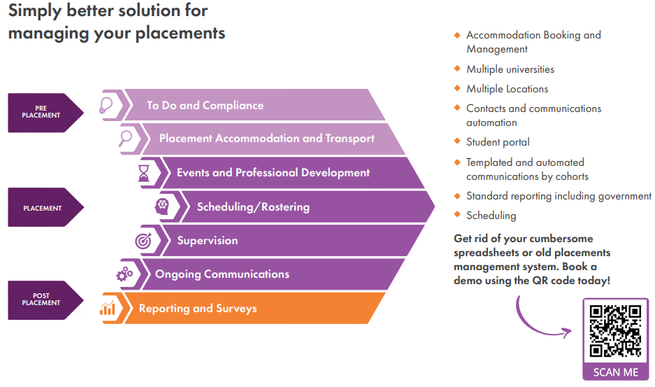 Originally co-developed with the two of the biggest leading institutions in South Australia, Placements Plus+ is a flexible, purpose-built solution that supports placement needs across rural, remote, and urban settings. Whether you're a small provider or a large organisation, it’s designed to grow with you.